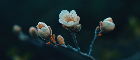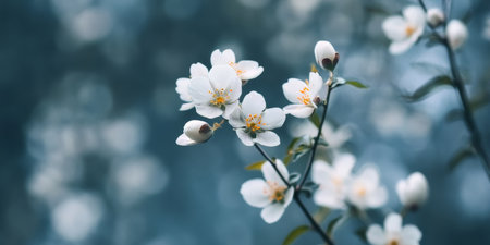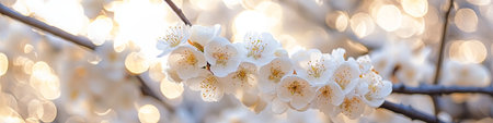 Delicate White Blossom Branch in Spring, Flowers in Bloom with Soft, Natural Golden Light
