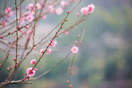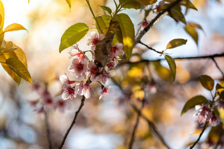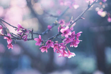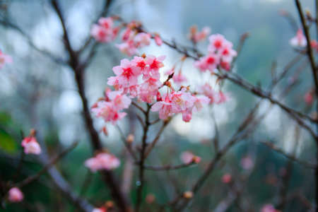 Close up background image of Wild Himalayan Cherry In the winter, Chiang Mai, Thailand. The flowers have pink color in a soft tone with low contras. Feeling fresh and relax. There is a copy space.