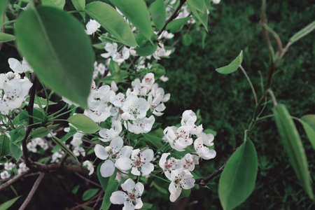 background with spring apple blossom. Blossoming branch in springtime Blooming apple tree in spring time.fresh Apple tree twig with flowers and leaves on garden