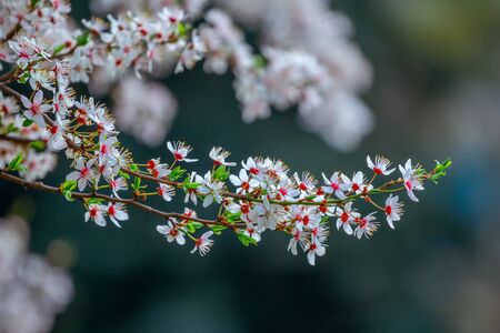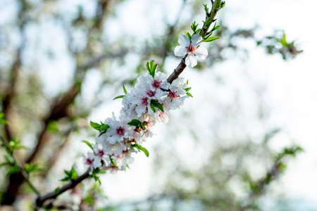 Branch of a tree with white flower close-up in spring on a sunny day.