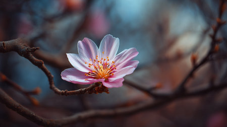 This close-up photograph features a soft pink blossom with intricate details, set against a blurred background of branches and muted colors, capturing the essence of springtime.