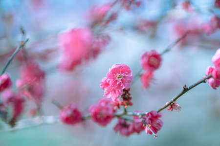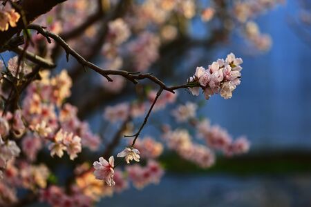 Beautiful peach branches with pink blossom in a blue sky. selective focus.