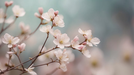 Closeup of blossoming sakura tree branches with fresh flowers. Ornated and stulized. AI generated illustration