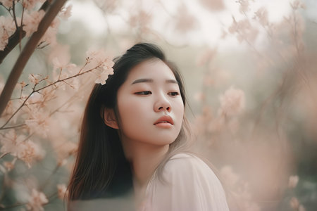 Korean girl in blossoming park. Portrait of Asian young woman among blossoming almond branches