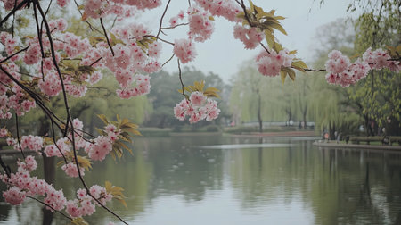 Tranquil spring scene featuring a pond reflecting a lush park, with blooming cherry blossoms gracefully framing the view. The overall atmosphere is peaceful and serene, with soft lighting and pastel colors.
