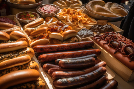 hot dog and sausage party, with a variety of different sausages on display, created with generative ai
