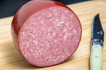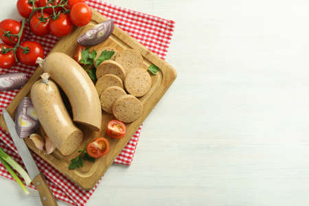 Concept of tasty food, liverwurst sausage, space for text