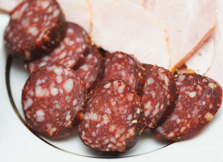 Sliced sausage on a white plate