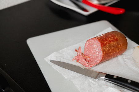Sliced salami sausage and knife on cutting board. Food idea preparation