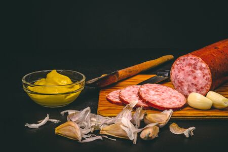 Dry smoked salami and garlic with peelings on dark background – Traditional food on a wooden board next to kitchen cutlery and glass bowl of mustard