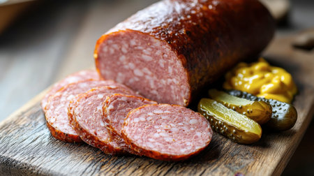 Ham sausage served on a cutting board with mustard, pickles, and slices of dark rye bread for a simple yet delicious snack.