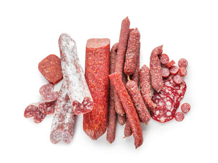Different tasty sausages on white background