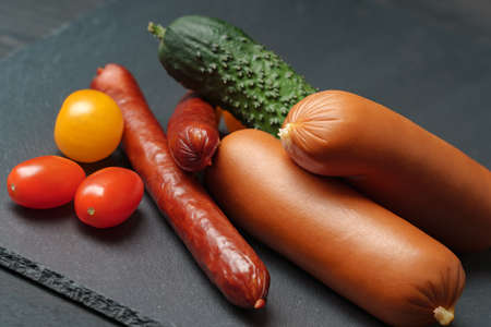 Sausage, sausages, tomatoes of red and yellow color, cucumber. On a dark stone stand.