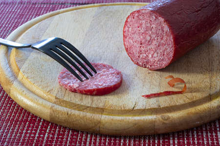 A slice of salami sausage on a black fork on a wooden board. Beautiful blurred background.