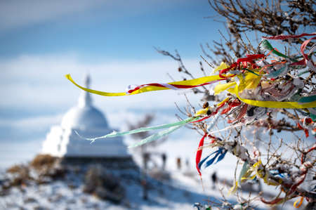 Lake Baikal, Russia - March 10, 2020: Buddhist Stupa at Ogoy island on Baikal lake. Ogoy is the largest island in the Maloe More strait of Lake Baikal.