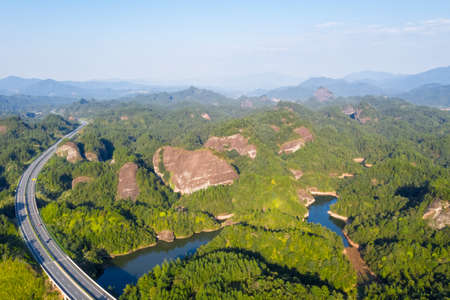 aerial view of expressway and danxia landform, tonggu county, jiangxi province, China