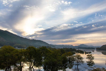 Beautiful sunrise on the mountain in winter. The sun shines down on a serene mountain landscape covered with trees and the calm river in the early morning.