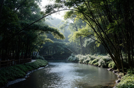 Explore the serene beauty of a bamboo forest featuring a stunning waterfall, surrounded by vibrant greenery and reflective waters