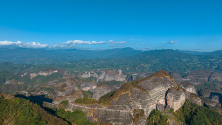 Landscape in Danxia Mountains (Danxiashan) in Renhua County in Shaoguan (Guangdong Province) in China. AAAAA rated tourist attraction. Yaotang village and Jinjiang river.