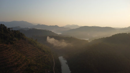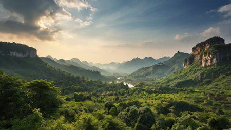 An aerial perspective showcases a mountainous landscape featuring dense forests, a winding river, and a cloudy sky. The scene is dominated by shades of green and blue, with soft sunlight filtering through the clouds. This scenic imagery could be suitable for various commercial or editorial applications.
