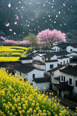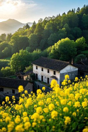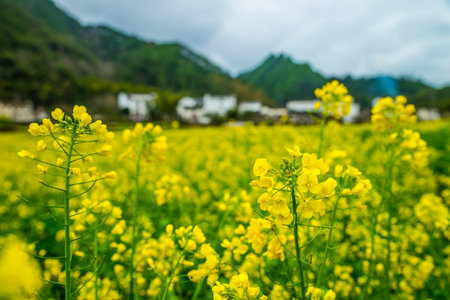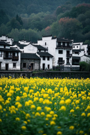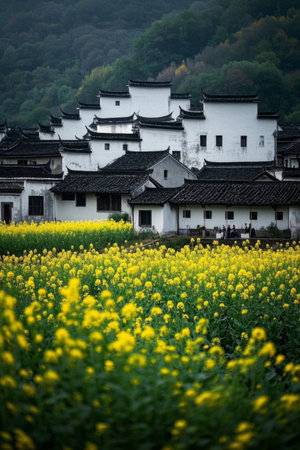 Rapeseed fields in Hui-style villages, Chinese countryside in idyllic paintings