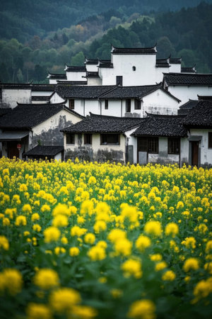Pastoral rapeseed flowers and white walls and black tiles landscape