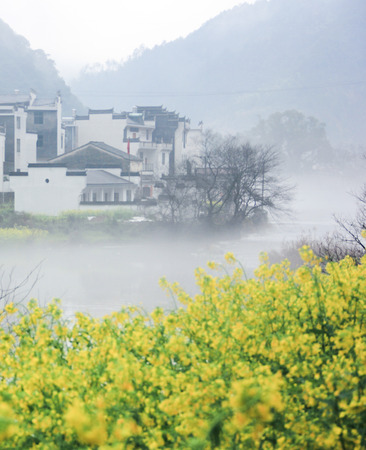 beautiful wuyuan mountain village in morning mist, rapeseed flowers blooming in China's most beautiful countryside.