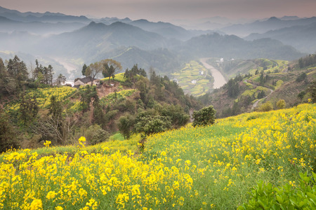beautiful spring landscape, rapeseed flower blooming with misty idyllic scene, wuyuan county, jiangxi province, China