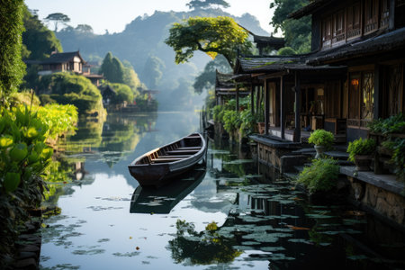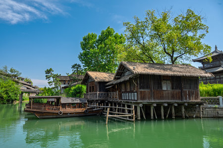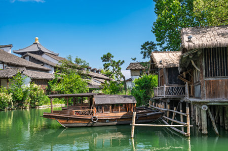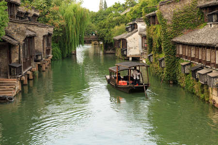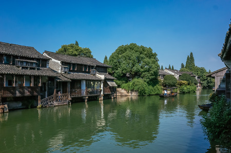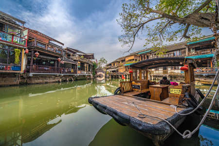 Old Chinese houses by river with boat in Wuzhen, China