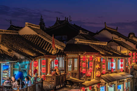 SHANGHAI, CHINA, NOVEMBER 01: Traditional Chinese buildings and top floor restaurants in Zhujiajiao ancient town at night on November 01, 2019 in Shanghai