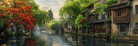 Wooden walkways and traditional Chinese buildings line a serene emerald river, with reflections and greenery creating a peaceful, cultural atmosphere