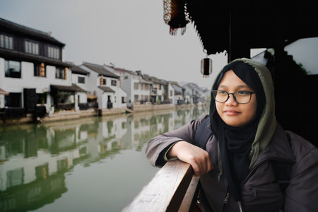 Portrait of a muslim girl wearing hijab sitting next to the small river near the ancient town in Wuxi, China.