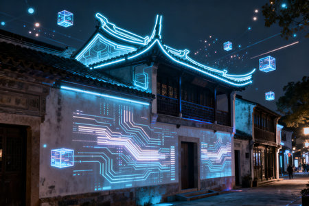 Glowing hologram of Chinese traditional house on night street. Future technology and networking concept. Double exposure.