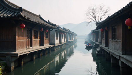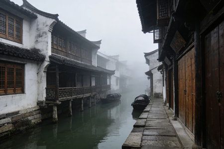 Traditional Chinese village featuring wooden homes lining a mist-covered canal on a moody day