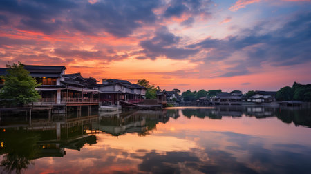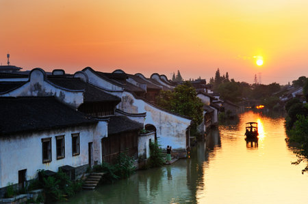 The ancient town of Jiangnan in China under the setting sun.