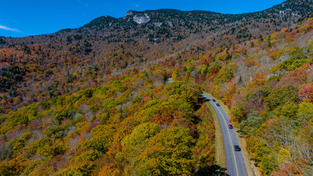 Aerial view of beautiful rock formations along the North Carolina mountains as the leaves start to change during the first part of fall.