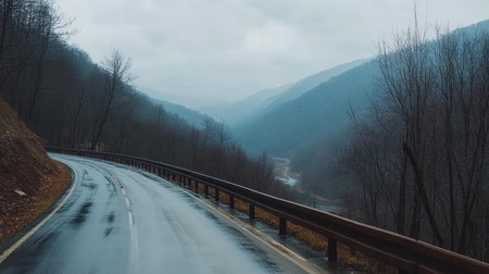 A tranquil mountain road winds through a misty landscape, surrounded by bare trees and a gloomy sky. Ideal for depicting nature's beauty and solitude.