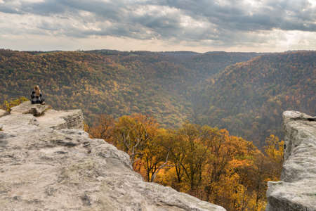 Young female woman overlooks the hills covered with fall trees from Raven Rock overlook at Coopers Rock State Forest West Virginia