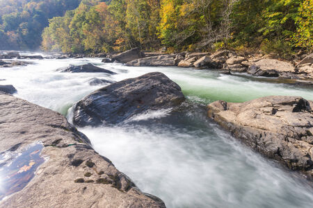 Tygart River cascades over rocks at Valley Falls State Park in Fairmont, West Virginia, fog over the river in the morning at sunrise