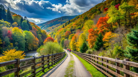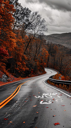 A scenic autumnal road winds through a mountainous landscape. The vibrant colors of fall foliage adorn the trees lining the path.