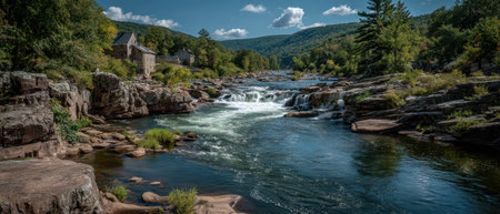 A calming river cascades over rocks surrounded by vibrant greenery and distant mountains under a clear blue sky.