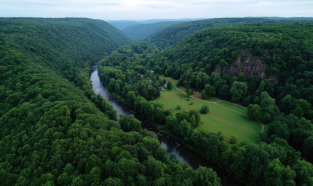 An aerial perspective captures a verdant valley, showcasing a river meandering through dense greenery. The image presents a harmonious blend of textures and shades, emphasizing natural forms. The composition offers ample copy space, making it suitable for various commercial applications promoting nature and environment themes.