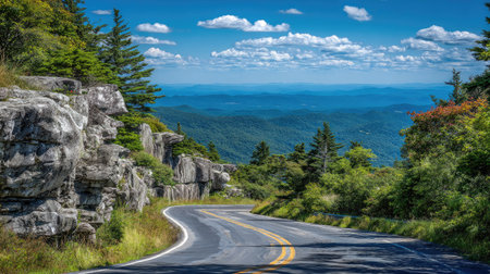 An asphalt road curves through a mountainous landscape. The scene features lush green trees, rocky cliffs, and a bright blue sky dotted with white clouds. This natural environment evokes a sense of freedom and travel, suitable for editorial and commercial applications. The composition emphasizes depth and perspective.