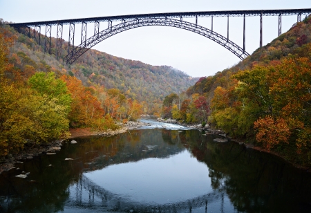 Vista of the river, mountains, and New River Gorge Bridge in the national park in West Virginia.