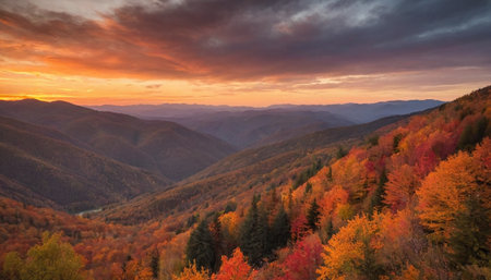 Breathtaking View of Autumn Foliage at Scenic Overlook during Sunrise in a Mountainous Landscape with Curved Road Below and Vibrant Colors