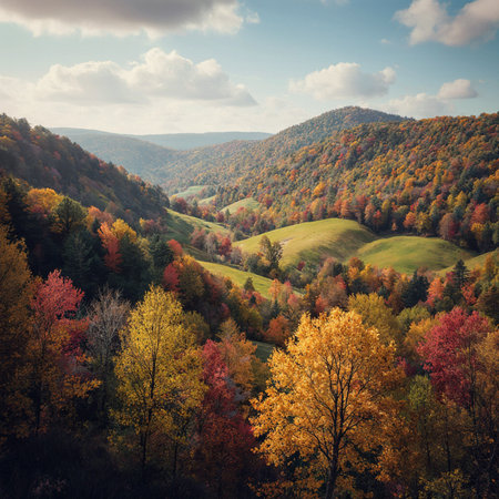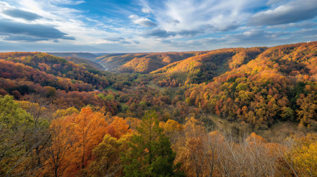 Vibrant fall foliage blankets rolling hills under a dynamic sky at a scenic overlook