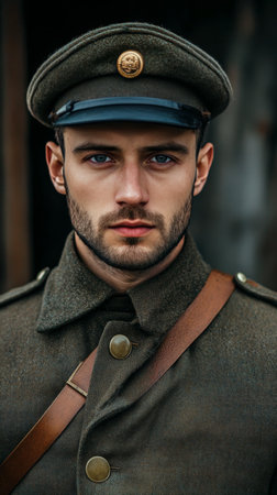 A young man dressed in a vintage military uniform gazes directly at the camera, showing thoughtful intensity. The setting features soft, natural lighting that enhances the mood.
