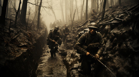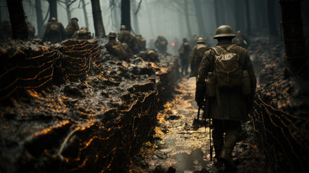 Military soldiers navigating through trenched terrain during wartime in a strategic operation