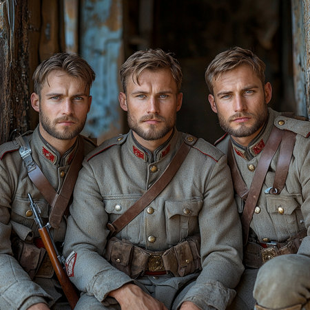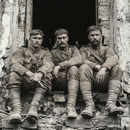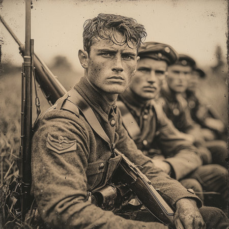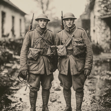 Brave soldiers from the First World War strike a proud pose with their rifles showcasing their uniforms in a vintage setting reflecting their camaraderie and commitment.