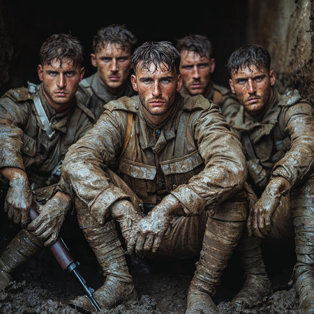 group of World War I soldiers displays camaraderie and determination posed with weapons amidst a muddy trench reflecting the hardships of wartime.